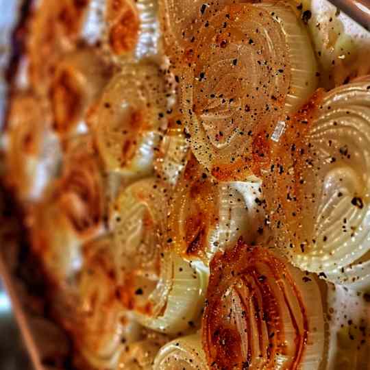 Arrange the onion rings in a pretty design in a baking dish that is 9×13 inches, making sure to keep all the rings and layers whole. If you want to make them even more special, cover them generously with olive oil and sprinkle salt and pepper on top.