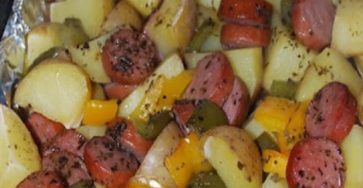 * Ingredients°1 box chimney sausage sliced from Eckrich.°8 golden yukon potatoes cut into quarters.°1 cube green pepper.°1 cube yellow pepper.°2…