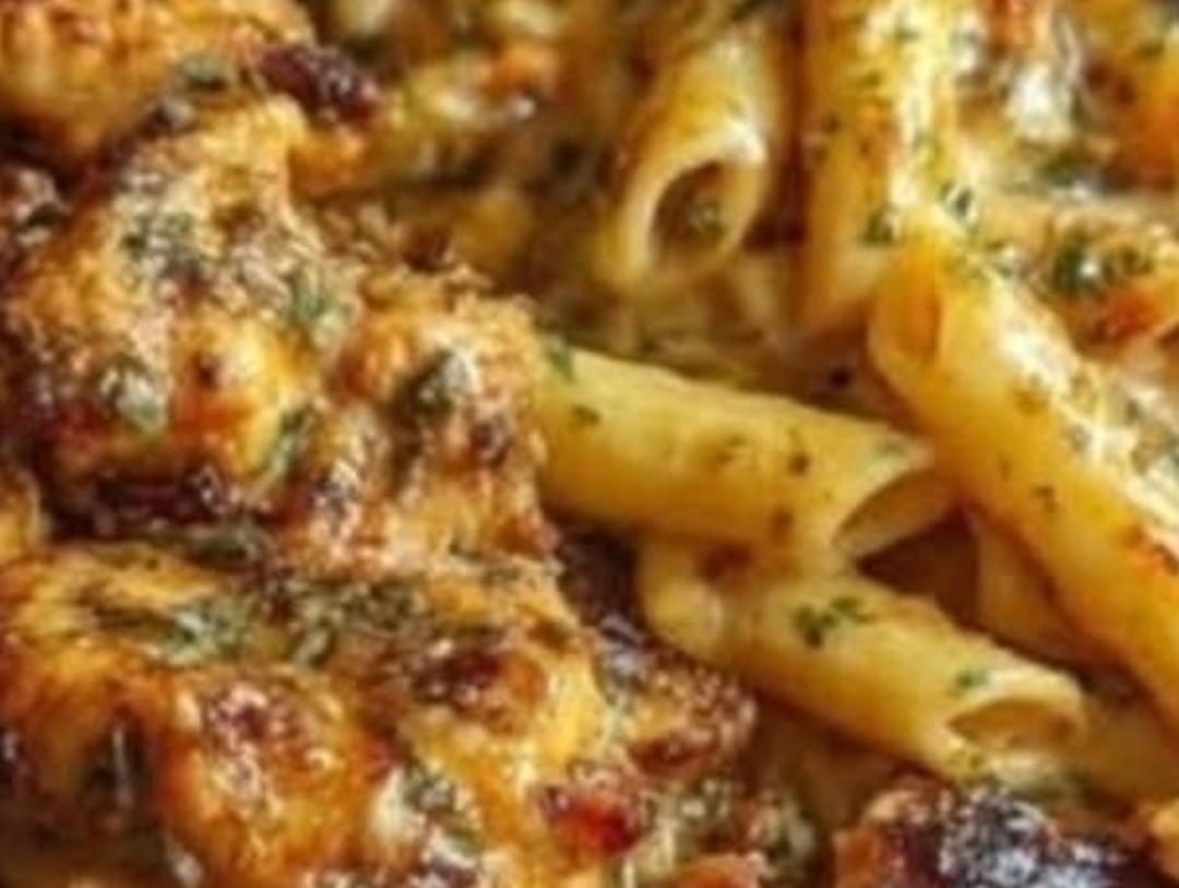 Ingredients:2 large chicken breasts, cut into bite-sized pieces3 tablespoons unsalted butter4 cloves garlic, minced1 teaspoon Italian seasoning1/2 teaspoon paprika1/2 teaspoon salt1/2 teaspoon black pepper1 cup heavy cream1 cup chicken broth1 1/2 cups shredded cheddar cheese1/2 cup freshly grated Parmesan cheese12 oz penne pasta2 tablespoons olive oilFresh parsley, chopped (for garnish)Directions:Cook penne pasta according to package instructions until al dente. Drain and set aside.In a large skillet, heat olive oil over medium heat. Add chicken pieces, season with salt, pepper, paprika, and Italian seasoning. Cook until golden brown and cooked through. Remove chicken from skillet and set aside.In the same skillet, melt butter and add garlic. Sauté for 1 minute until fragrant.Pour in chicken broth and heavy cream. Stir well and bring to a simmer.Add cheddar cheese and Parmesan cheese. Stir until melted into a smooth, creamy sauce.Return chicken to the skillet and toss to coat with the sauce.Add cooked penne pasta and stir until everything is evenly coated in the cheesy garlic butter sauce.Garnish with chopped parsley before serving.Prep Time: 15 minutes | Cooking Time: 25 minutes | Total Time: 40 minutesKcal: 615 kcal | Servings: 4 servings