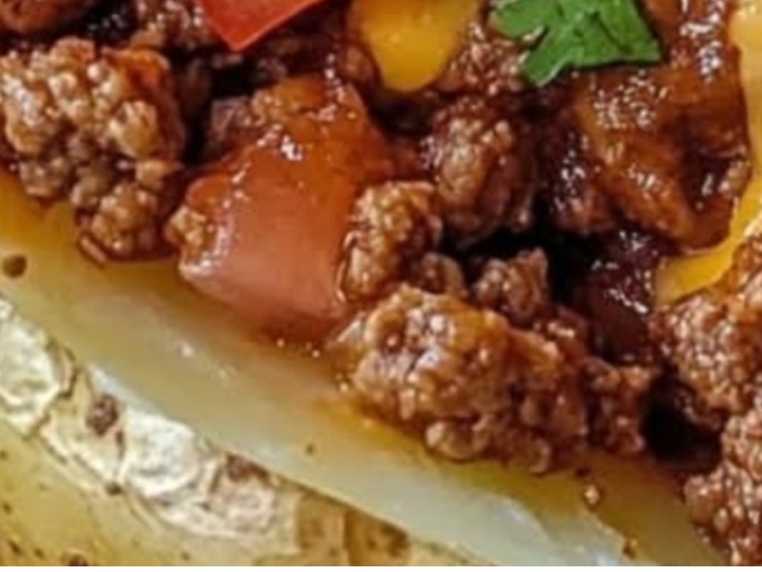 • Spoon the taco-seasoned beef evenly over the potatoes.