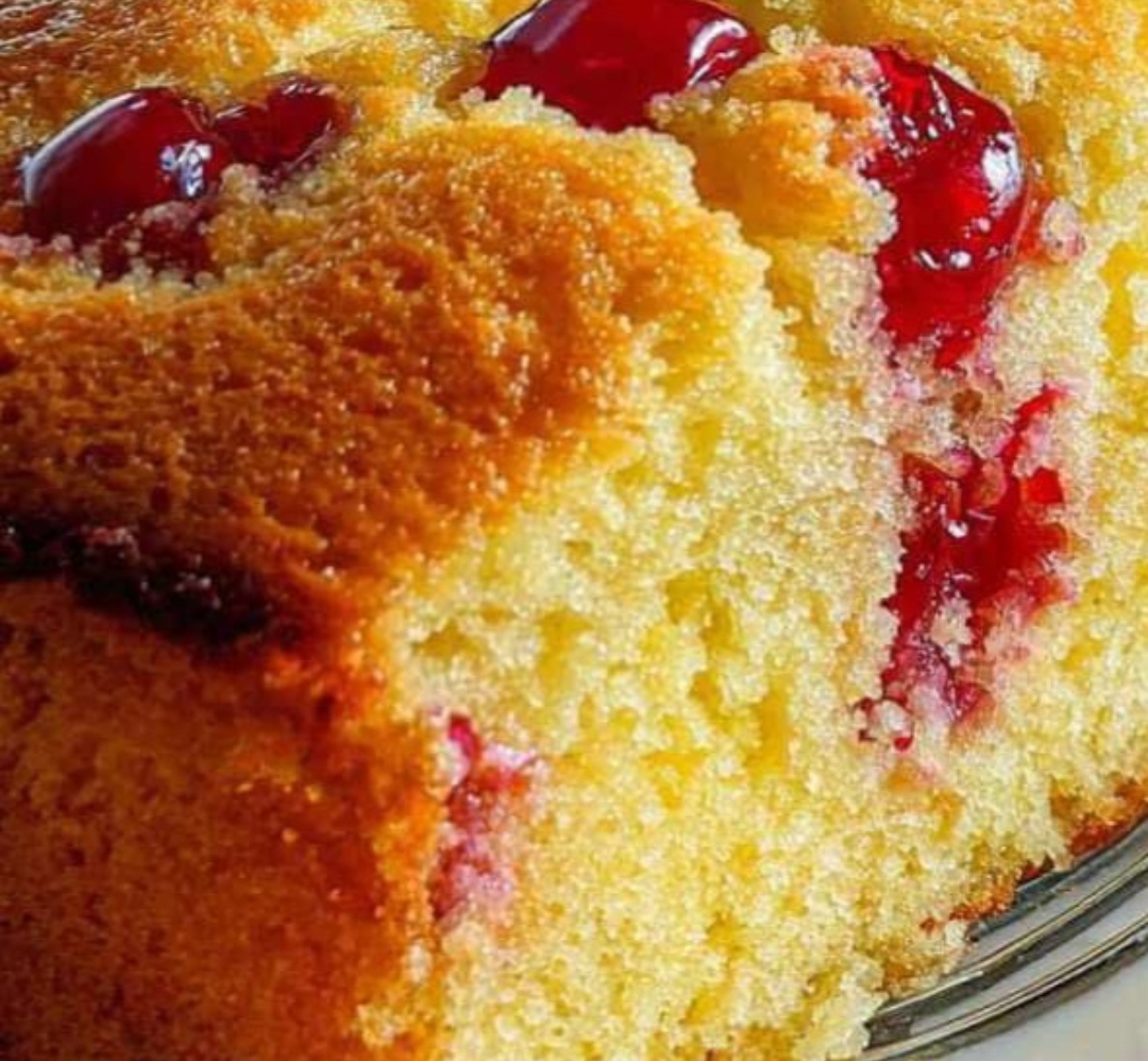 - Pour half of the batter into the prepared tin. Add a layer of cherries, then top with the remaining batter. Place a few more cherries on top (they will sink a little as it bakes).