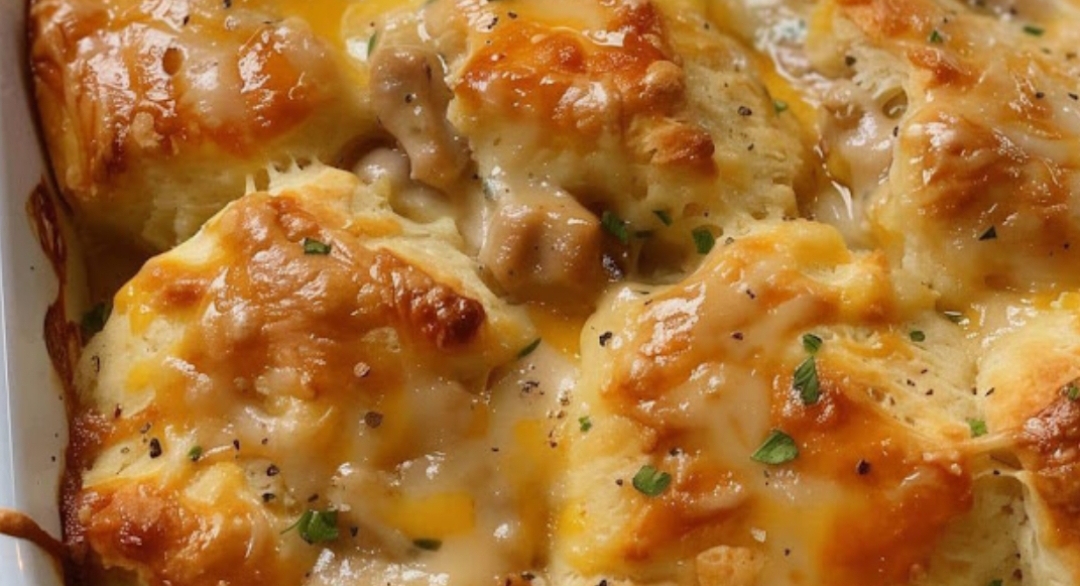 Pour the chicken mixture into the pan that has been prepared. Sprinkle the remaining cup of grated cheese on top.Cook in the oven for 25-35 minutes until bubbly and the biscuits turn golden brown.