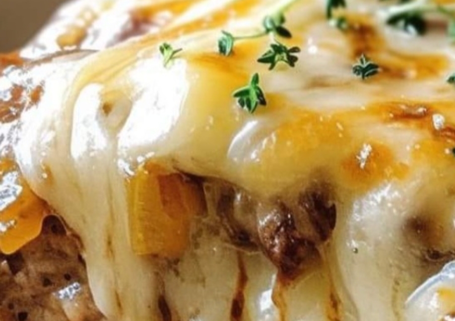 Serve the meatloaf hot, sliced with the gooey melted cheese on top, and enjoy the rich, savory flavors!