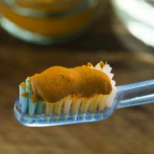 Mix a small amount of turmeric powder with water to form a paste. You can also add a pinch of salt for its abrasive properties which help in removing surface stains on the teeth. - Application