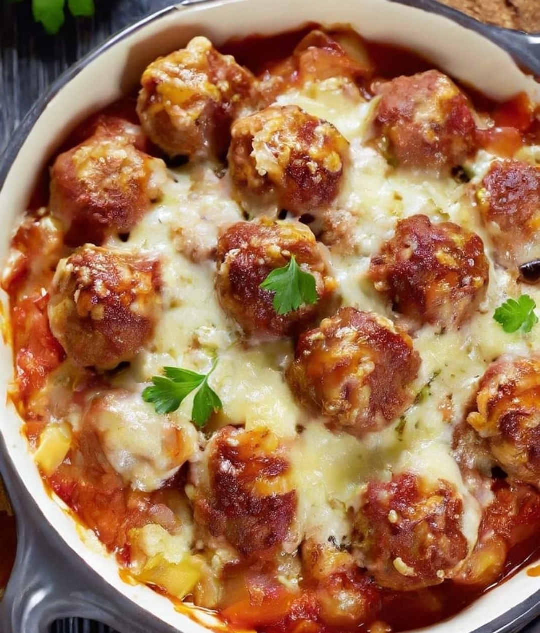 In a large baking dish, stir together uncooked pasta, marinara sauce, water, and meatballs.