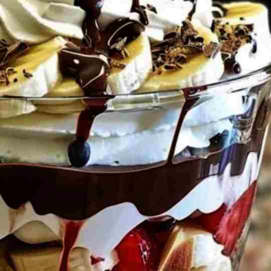 – In a large trifle dish or individual dessert glasses, start by layering the sliced bananas and strawberries at the bottom.