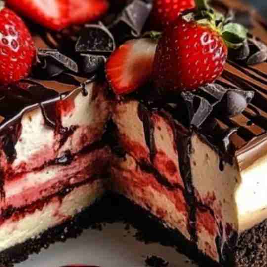 This layered strawberry chocolate cheesecake is perfect for special occasions or as a show-stopping dessert for any gathering!