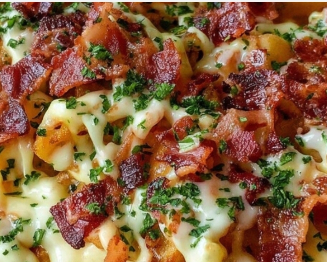 - Assemble: Place fries on a serving dish. Pour cheese sauce over the fries. Sprinkle with crumbled bacon and fresh parsley.