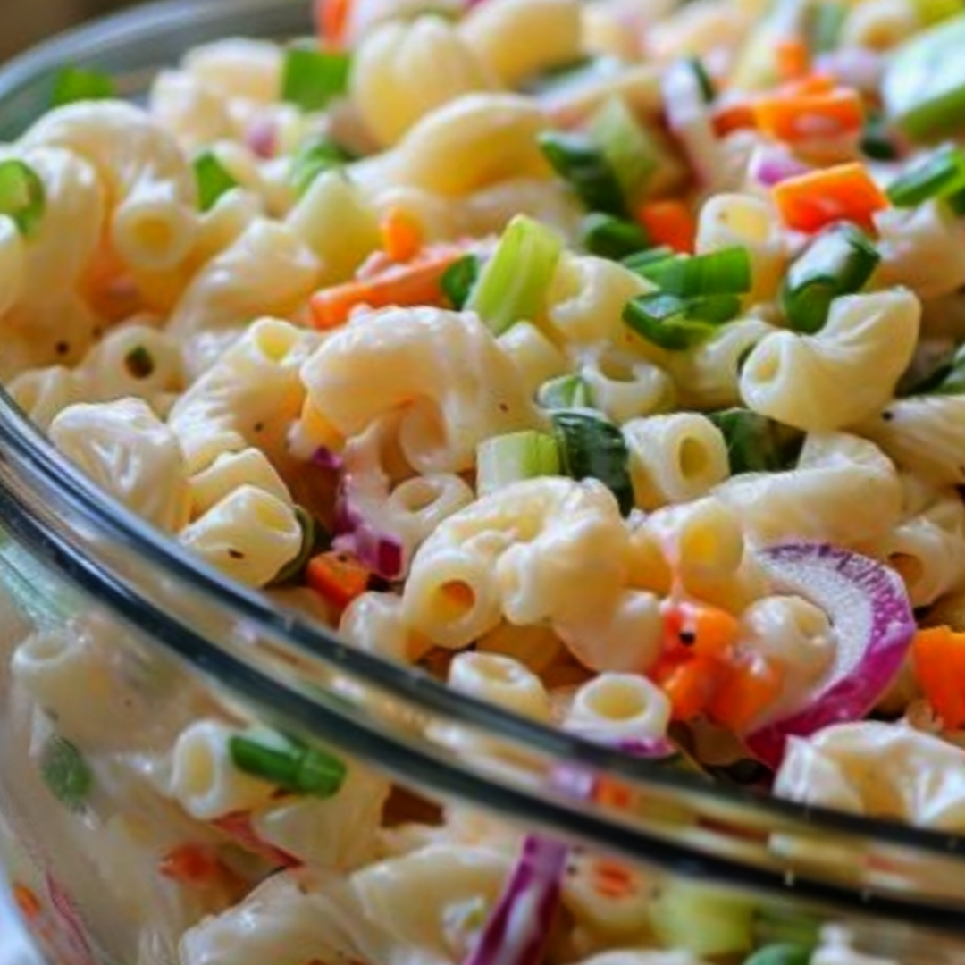 2. After the macaroni has cooled, throw it in a big bowl with the chopped celery, shredded carrot, minced sweet onion, and sliced green onions.