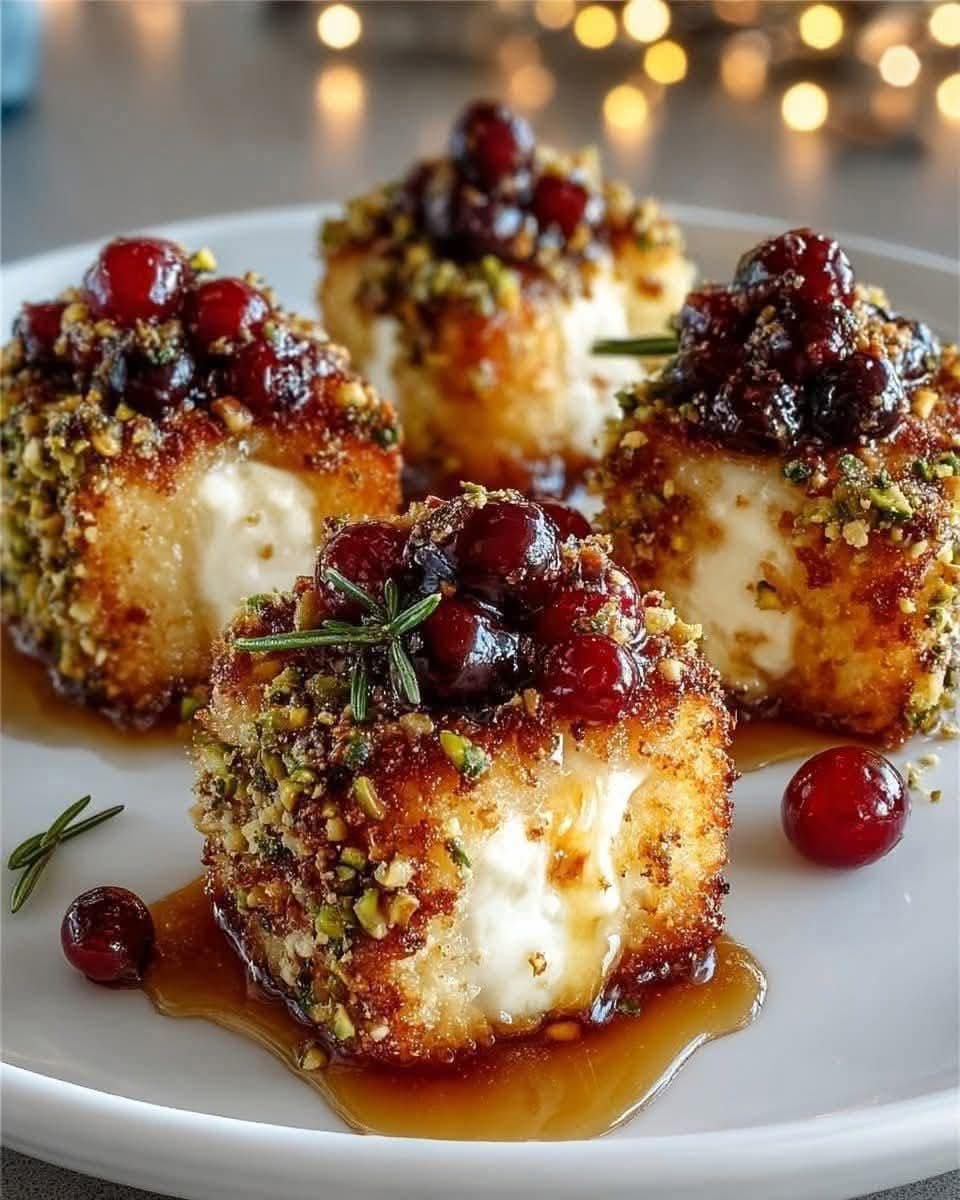 Pistachio-Crusted Brie Bites with Cranberry Honey Glaze