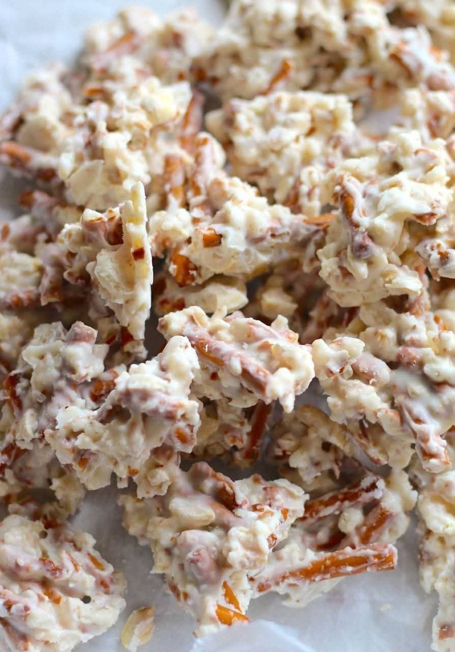 2. In a large bowl, combine cereal, crushed pretzels, and peanuts.
