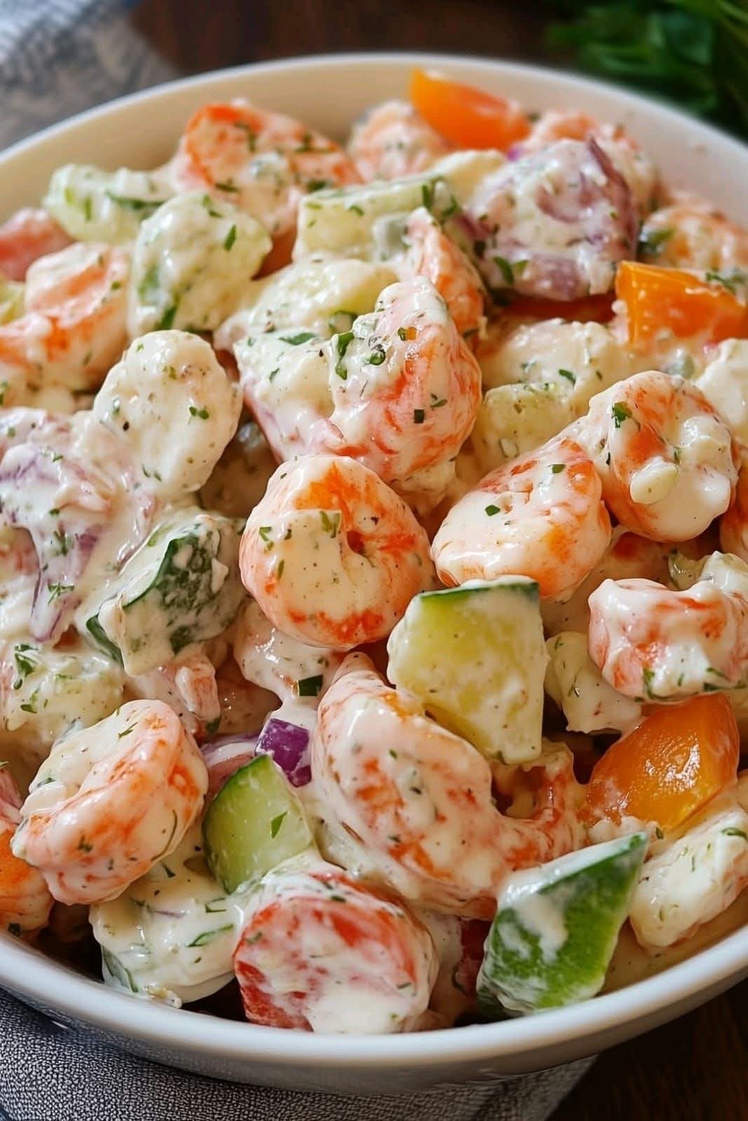 Toss the Salad: Pour the dressing over the seafood and vegetable mixture. Using a spatula, gently fold everything together until all components are evenly coated. Be careful not to overmix.