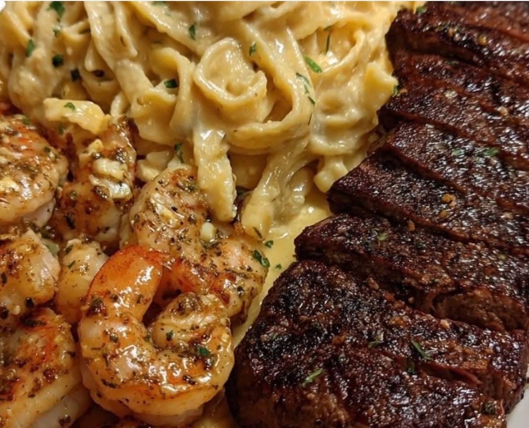 Add linguine to an outsized pot of salted boiling water and let cook until hard , about 7 minutes. Drain well. While pasta is cooking, add butter and vegetable oil to an outsized skillet over medium heat. Add garlic and red pepper flakes and cook for one minute. Add shrimp, salt, and pepper to pan and cook, stirring frequently, until shrimp are cooked through and pin, about 5 minutes. Remove shrimp to a plate and put aside . Stir in wine (or chicken broth) and juice and cook for 1 minute. Remove skillet from heat and stir in parsley. Add linguine and shrimp back to skillet and toss to coat in sauce.Divide between two plates or bowls and top with sliced steak. Sprinkle on additional chopped parsley. Garlic Butter Steak Heat an outsized forged iron pan over high heat and sprinkle steak with salt and pepper. When pan is hot, brush steak lightly with oil. Place steak in pan and cook for about 3-4 minutes on all sides , until cooked to desire doneness (should be about 135 degrees for medium rare and 140 degrees for medium). While steak is cooking, mix butter and garlic together during a small bowl. Top steak with spread and let it rest for about 5 minutes before slicing (be bound to slice against the grain). Enjoy !!