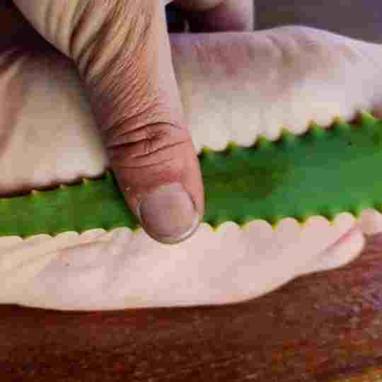 Select one large aloe vera leaf from an aloe vera plant. Use a sharp knife to slice it open lengthwise.