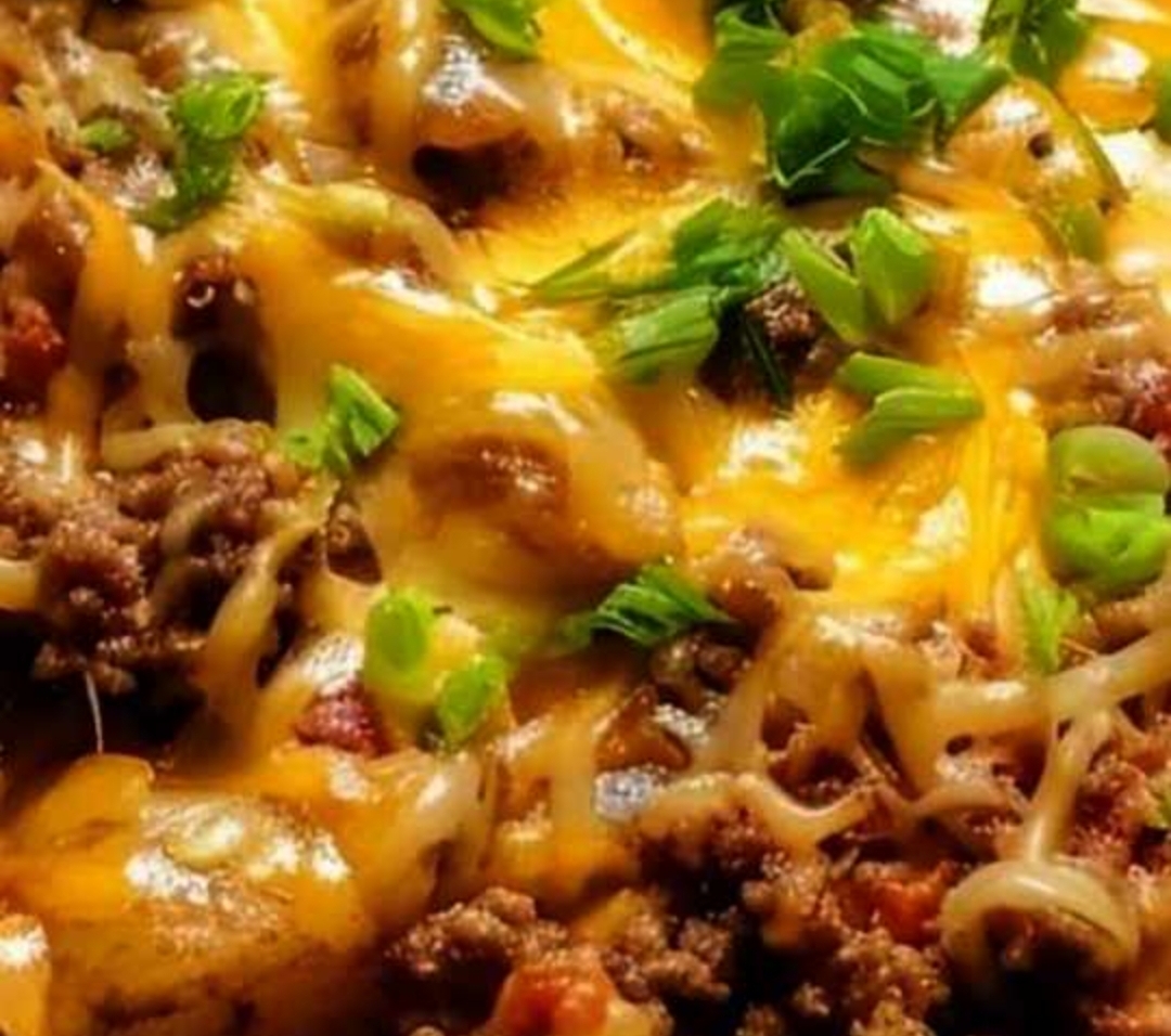 2. Kickstart your slow cooker magic by layering the diced potatoes, followed by the browned beef-onion mix.
