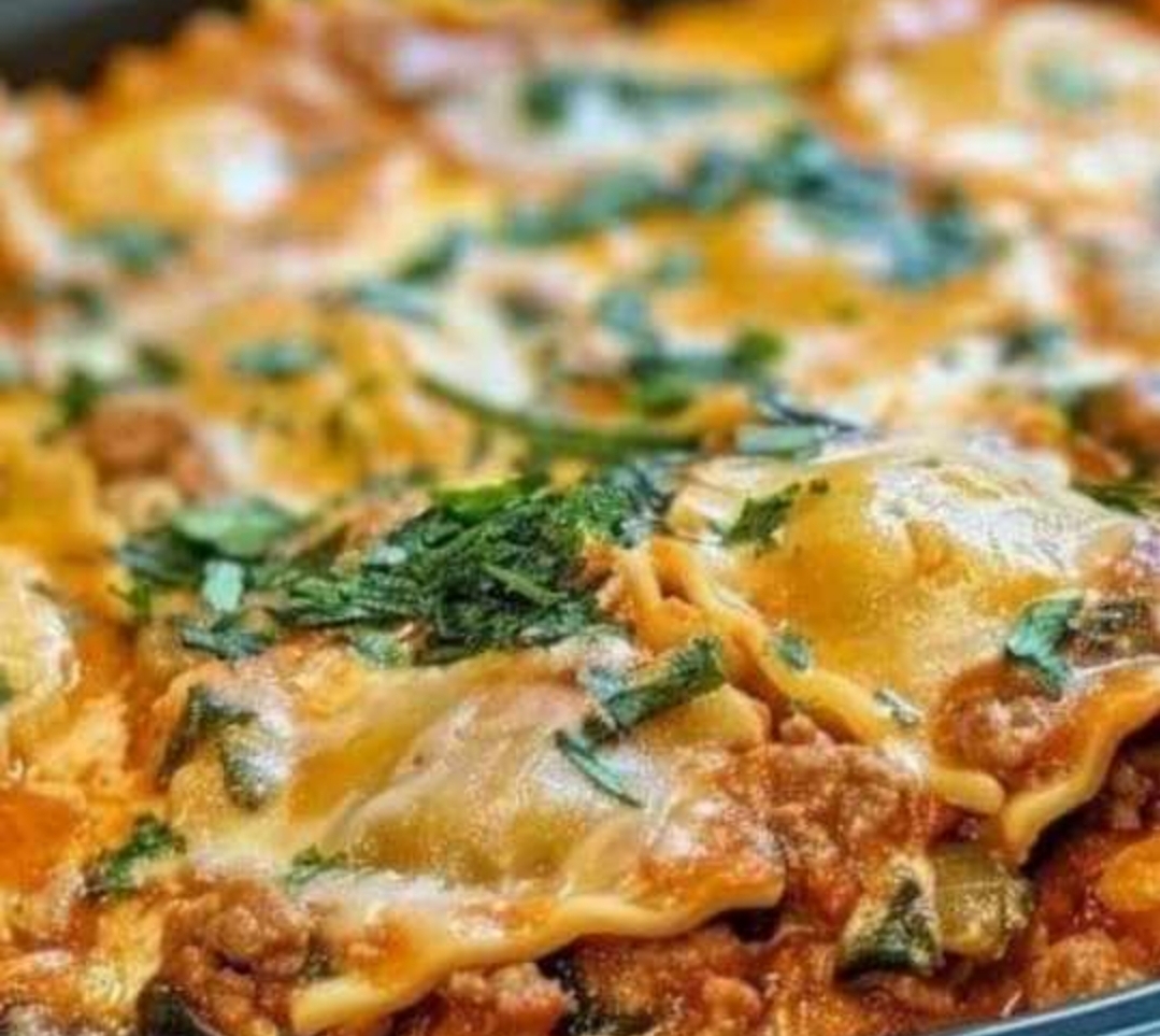 Ravioli Lasagna with Beef and Cheese Cooked in a Slow Cooker with Spinach