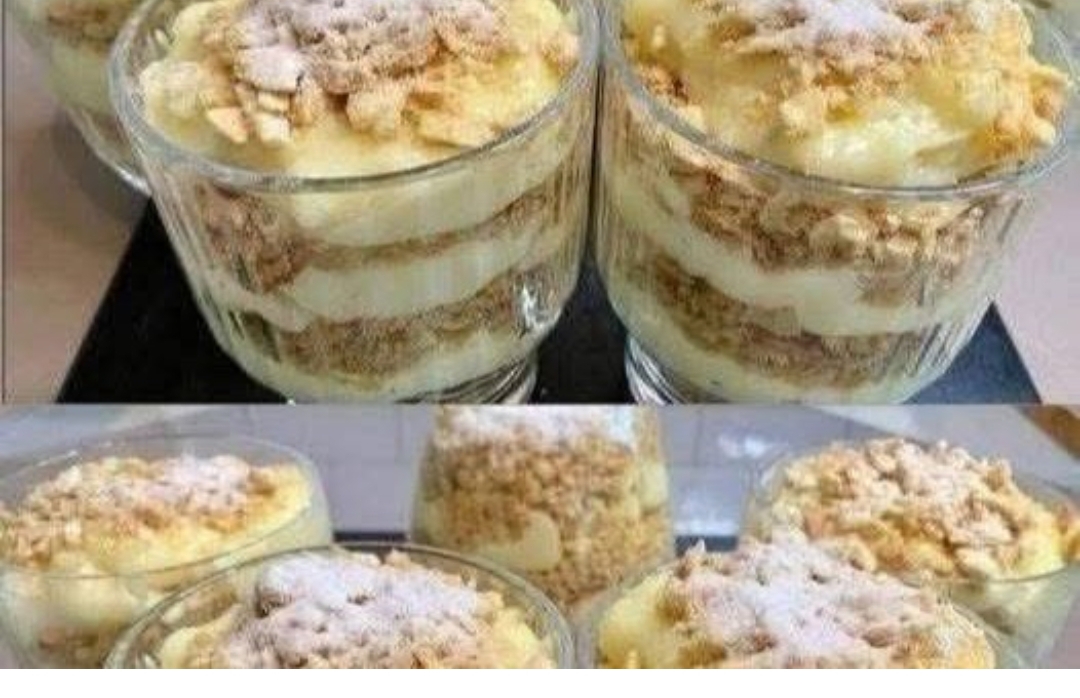 Add the remaining crumbs to the pan.Place the pan on the stove and heat over medium heat.Cook until golden brown, stirring constantly to prevent burning. This will take about 8-10 minutes.Preparation of the custard:Pour the sugar into a non-stick pan and add the egg yolks.Pour in the milk and whisk everything together.Add the flour and whisk again until smooth.Place the pan on the stove and heat over medium heat.Boil the cream until it thickens, about 6-10 minutes.Remove the pan from the heat and let the cream cool.Assemble the desserts:Once the dough and cream have cooled, you can start assembling the dessert.Place 2 tablespoons of crumbs of sand in glasses or cups.Then add 2 tablespoons. Cream.Repeat the layers until the container is full.Let the cake cool in the refrigerator for about an hour.Serve and garnish as desired.Enjoy!